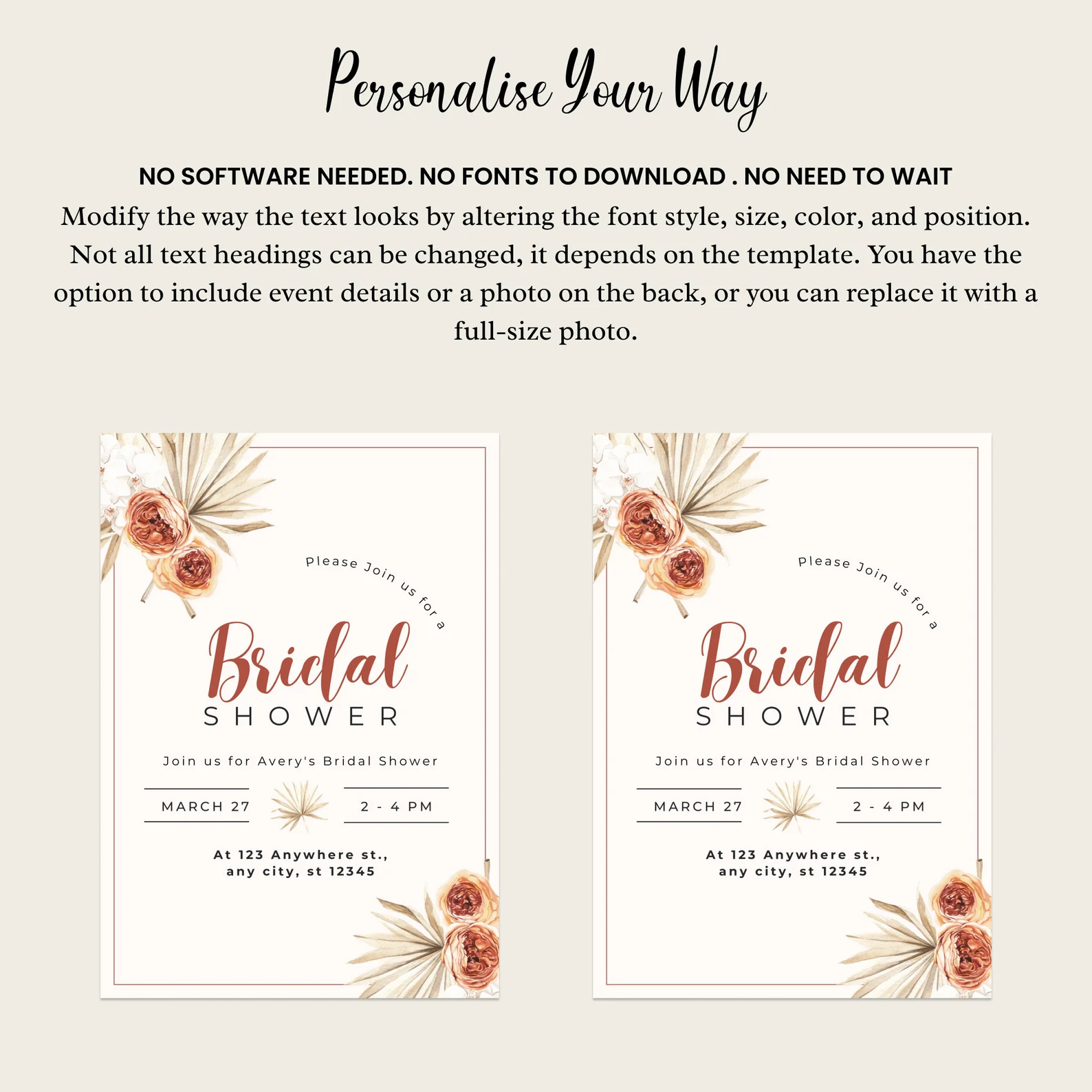 With this Autumn Bohemian Bridal Shower Invite, you can customize everything—edit the wording, change the fonts, adjust the background colors, and even add a personal touch with a photo of you and your future spouse. Want to include extra details? Easily add them to the back of your invitation.The best part? Save money and time by editing and printing the files yourself! Or, for a modern and eco-friendly approach, send them as evites via email or text. Celebrate your bridal shower in style with this chic, customizable Autumn Bohemian Bridal Shower Invite