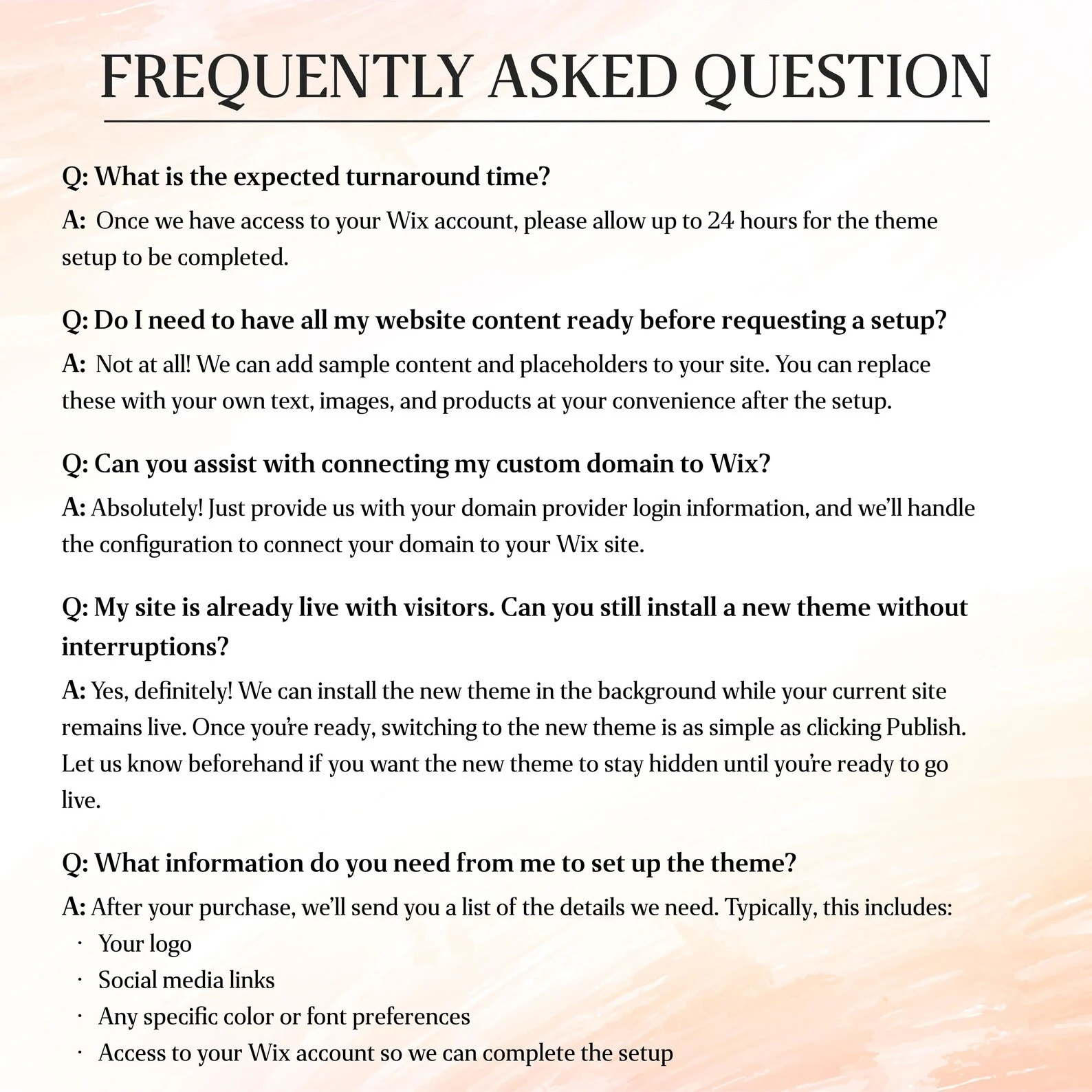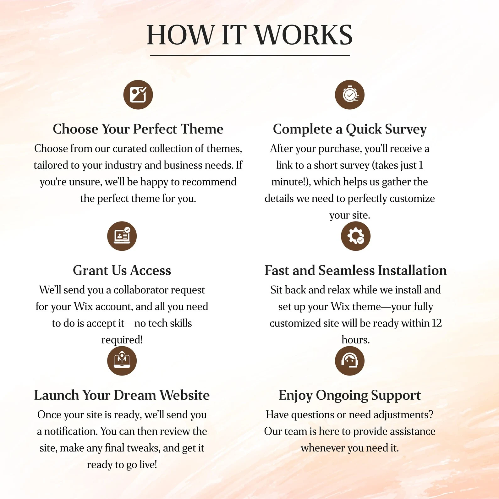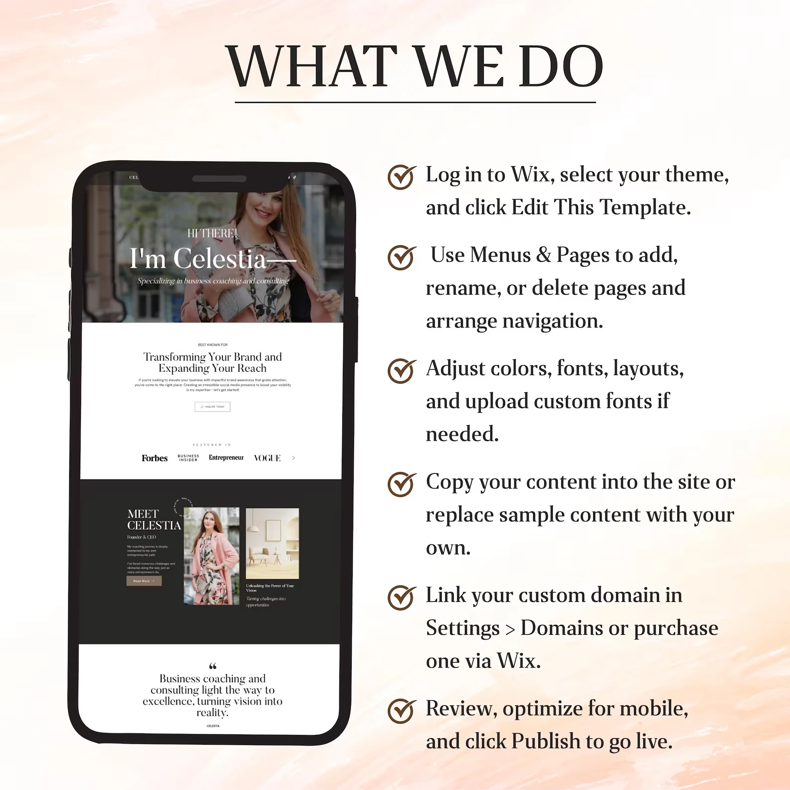 We’ll help you log in to Wix, select your template, and get everything set up. You’ll be able to: Adjust colors, fonts, layouts, and upload custom fonts if needed. Copy your content into the site or replace sample content with your own. Link your custom domain via Wix settings or purchase one directly. Review the entire site, optimize for mobile, and publish it live. This template is ideal for coaches, consultants, and entrepreneurs who want a clean, modern, and fully functional website. It’s easy to customize and comes with all the tools you need to establish a strong online presence. Launch your website quickly and grow your brand with confidence!Instant Download