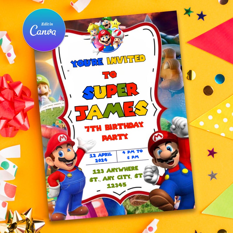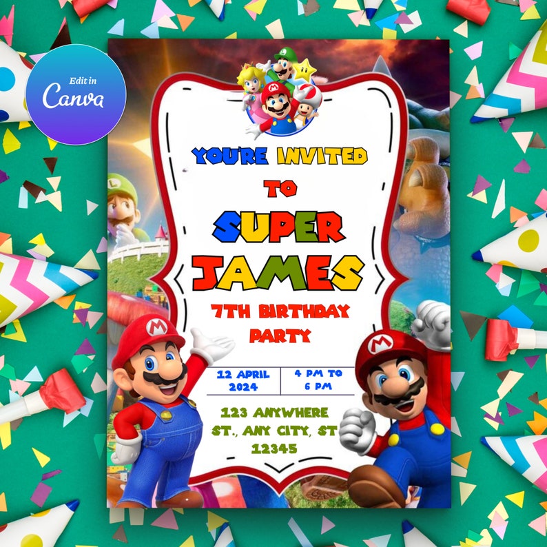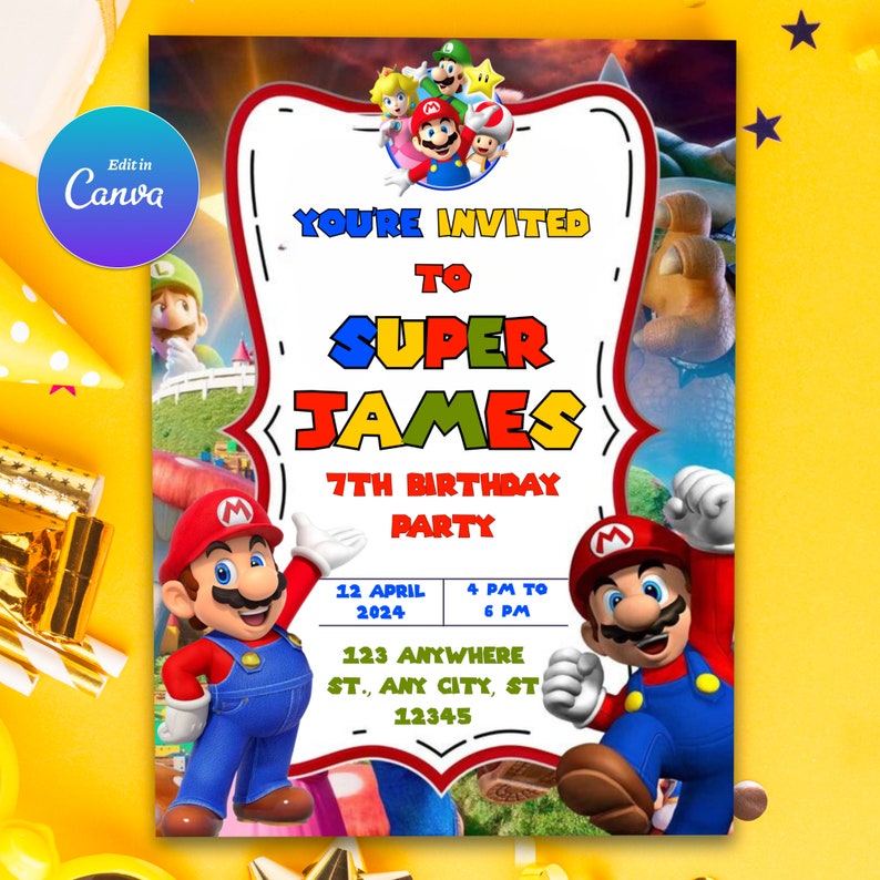 - Follow the link to access your editable Super Mario Birthday Invitation.