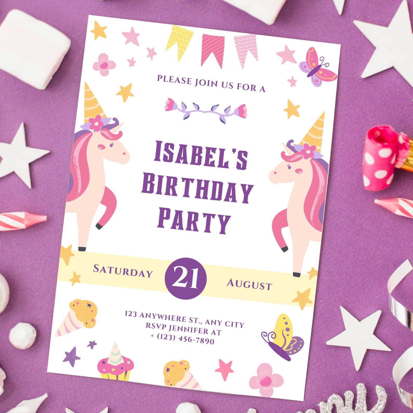 With the help of this customizable unicorn birthday invitation template, you can make your child's birthday party even more memorable. This colorful and beautiful design is simple to alter to add personalized attributes, and it will attract the attention of your guests from the moment they receive it. This template is ideal for adding a magical touch to any celebration. It can be customized easily and is compatible with a variety of editing software programs.