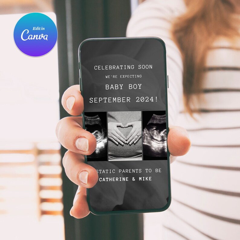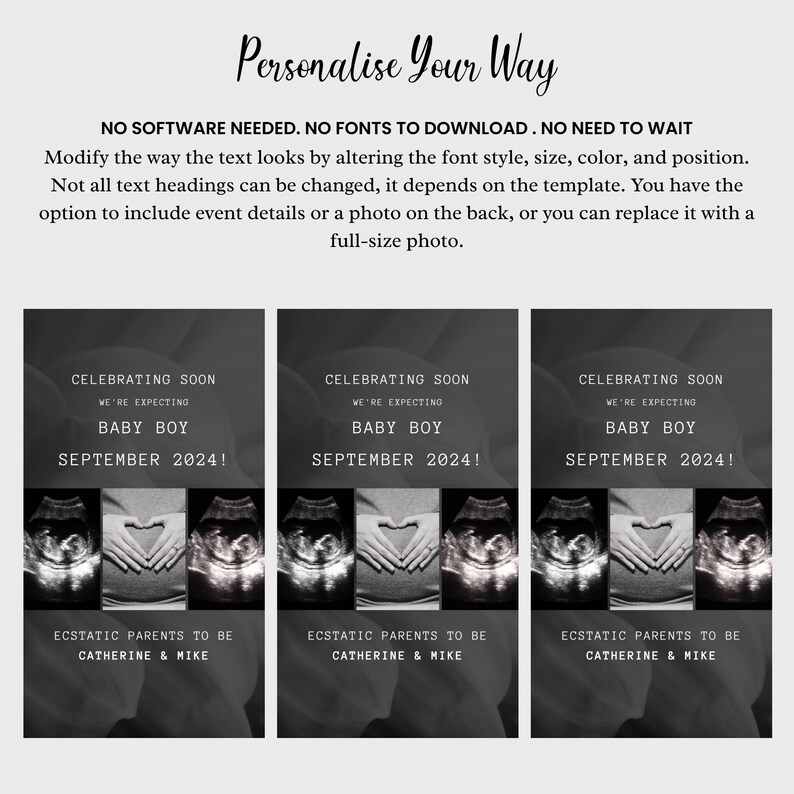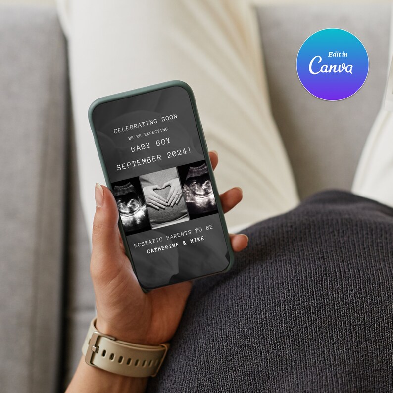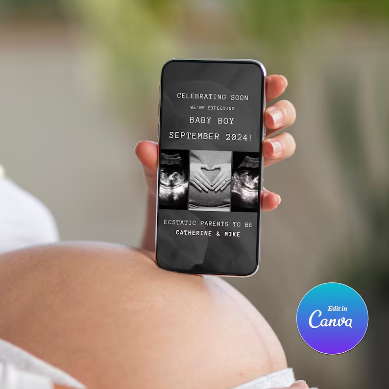 - Follow the link to access your editable digital pregnancy announcement cards.