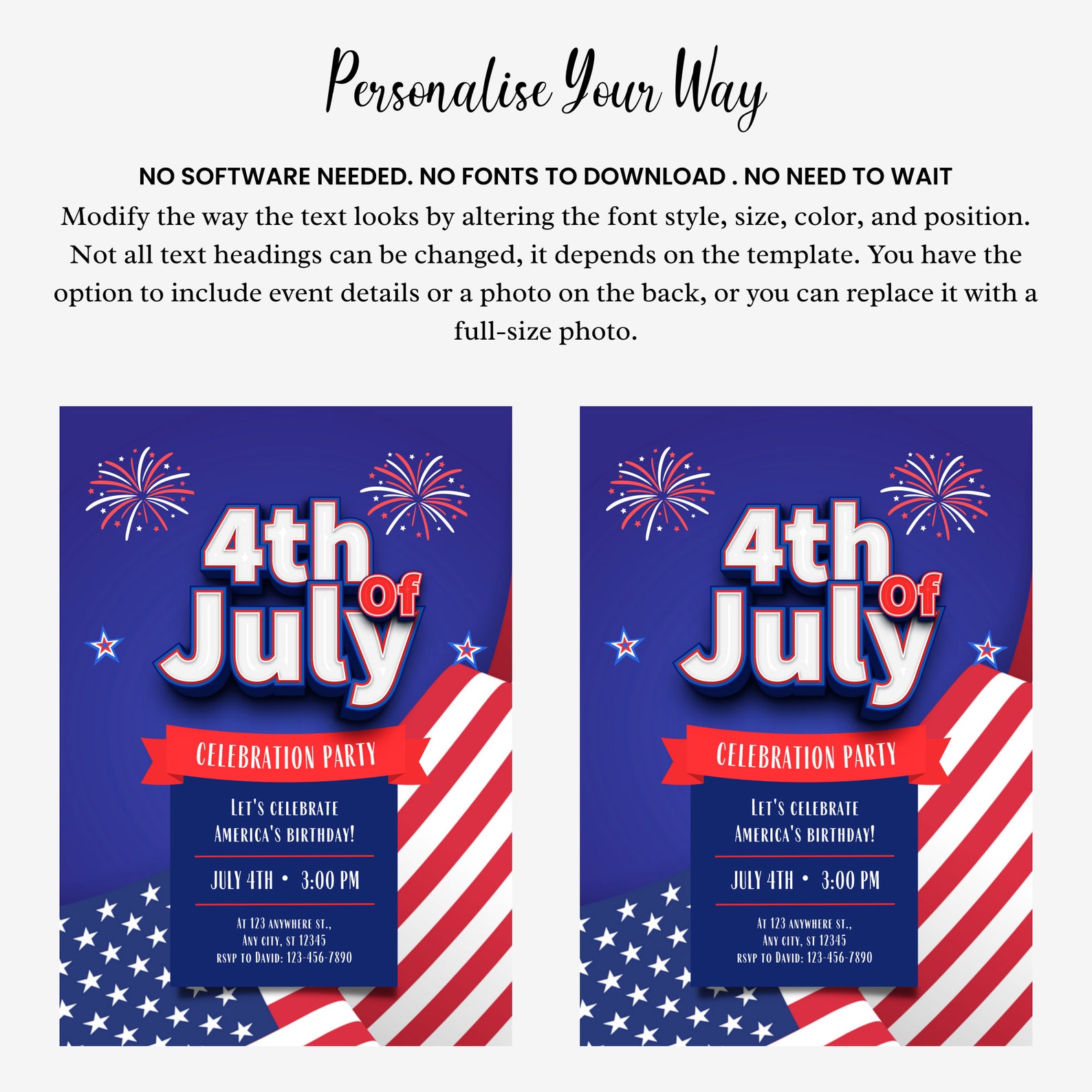 We offer the perfect blend of convenience, quality, and customization to make your 4th of July Digital Invitation truly special. Our editable templates allow you to personalize every detail effortlessly—whether for a patriotic birthday celebration or a themed event. No design skills? No problem! Our user-friendly interface ensures a seamless experience, enabling anyone to create a stunning, professional-quality invitation. Impress your guests with a beautifully crafted invitation that reflects your unique style. Choose us for an easy, high-quality, and standout invitation experience.Instant Download