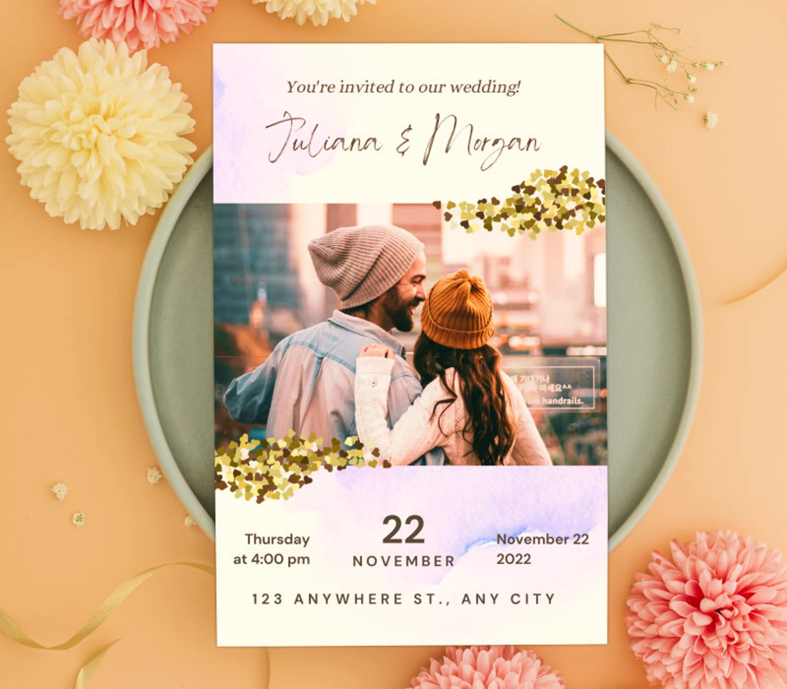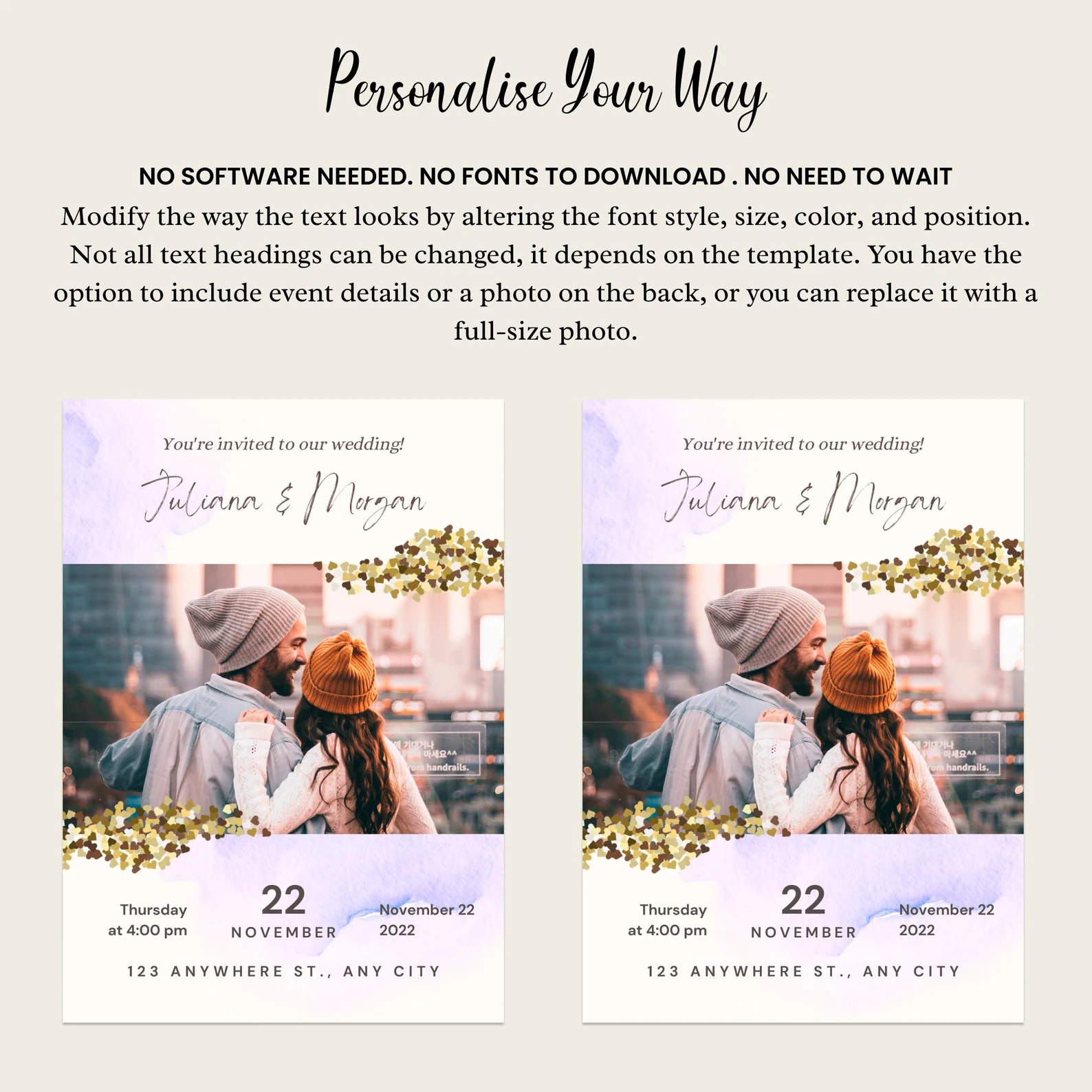 - Adjust fonts, colors, placements, and sizing to create the perfect invitation.