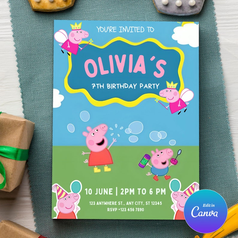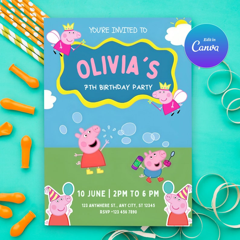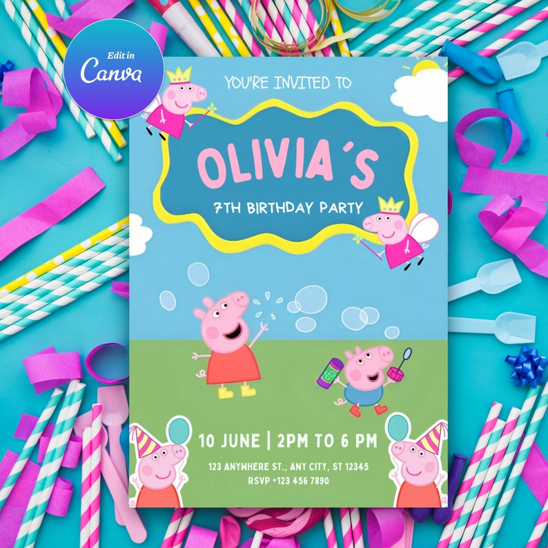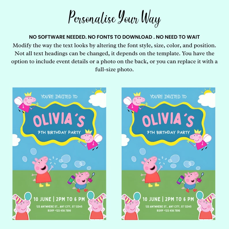 instant download, you can edit, personalize, and print the invitation within minutes—no waiting, no hassle! Whether you're hosting a Peppa Pig-themed birthday for a girl or just looking for an adorable cartoon invitation, this template is easy to customize and perfect for any celebration.
