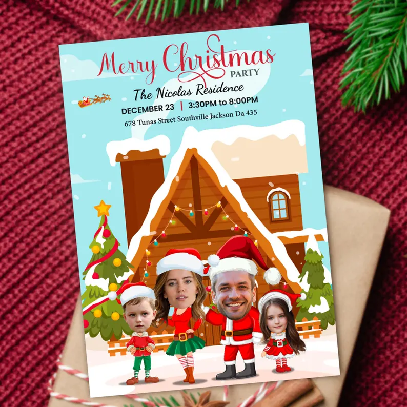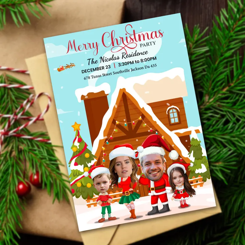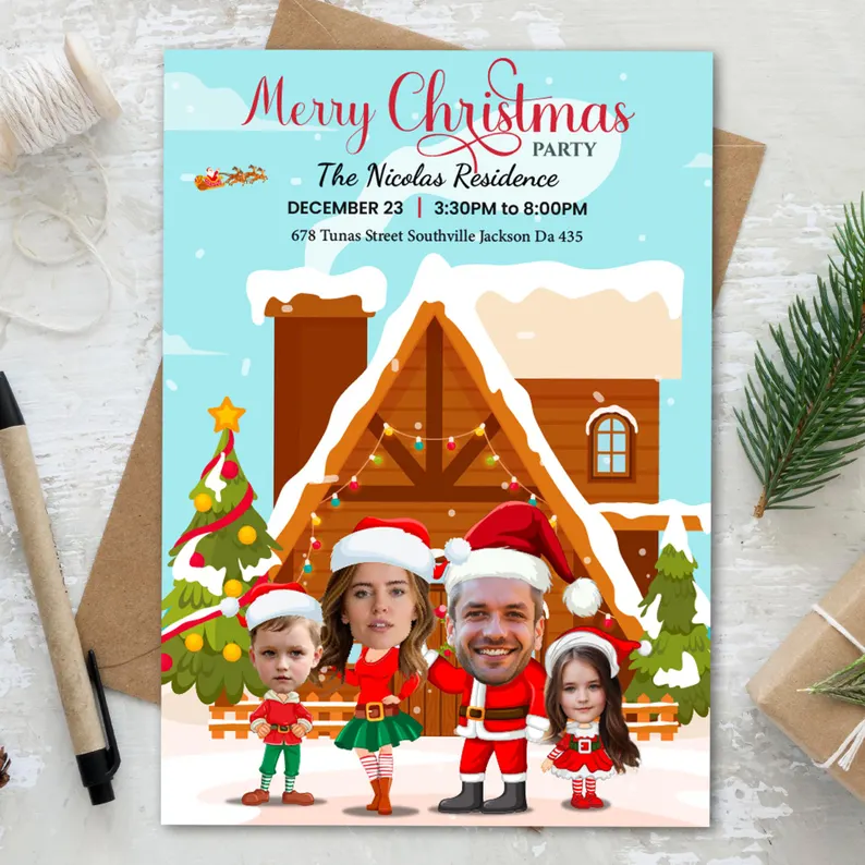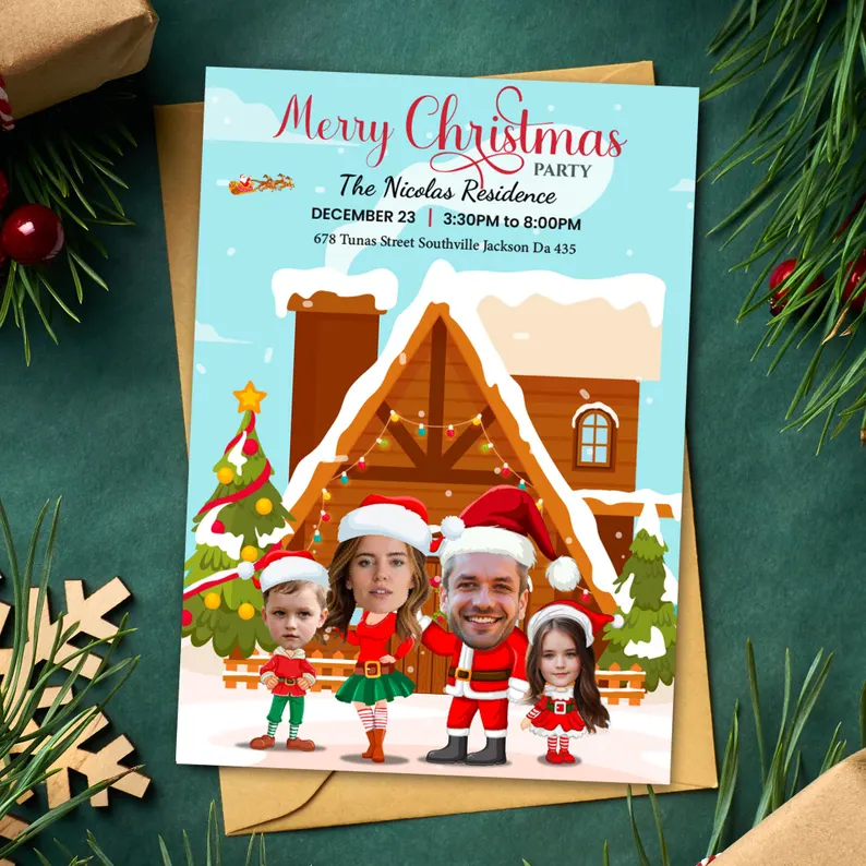 - Unique Personalized Funny Family Christmas Card with custom cartoon design.