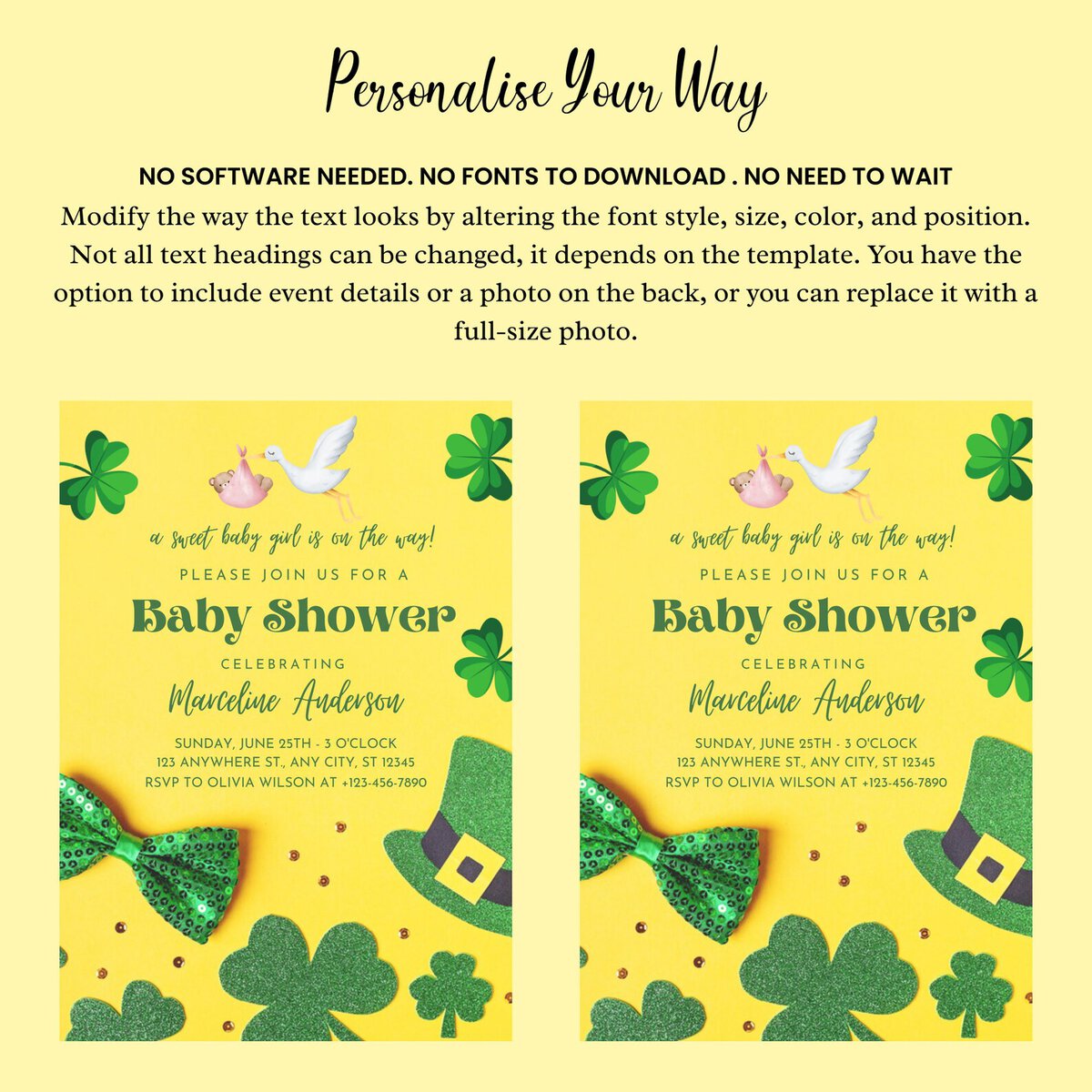 • You can Personalize your St. Patrick’s Day Baby Shower Invitation effortlessly.